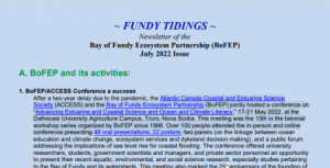 In 2004 the Bay of Fundy Ecosystem Partnership created an award to recognize the significant efforts of individuals in promoting and advancing the environmental stewardship of the Bay of Fundy, reflecting the Mission Statement and Guiding Principles of BoFEP. BoFEP is proud and delighted to announce that the 2022 Environmental Stewardship Award will be presented …