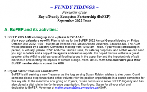 We are posting this note to invite you to join or renew your membership in BoFEP for 2025. We rely on membership income to fund the core activities of this volunteer environmental organization. For your annual dues, $25 (individual) or $100 (organization), (note: additional donations are always welcome!!), you will receive the quarterly Fundy Tidings …