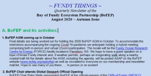 The autumn issue of Fundy Tidings, the quarterly newsletter of the Bay of Fundy Ecosystem Partnership is now available online. Download at: Fundy Tidings autumn 2020 MSWord or Fundy Tidings autumn 2020 PDF